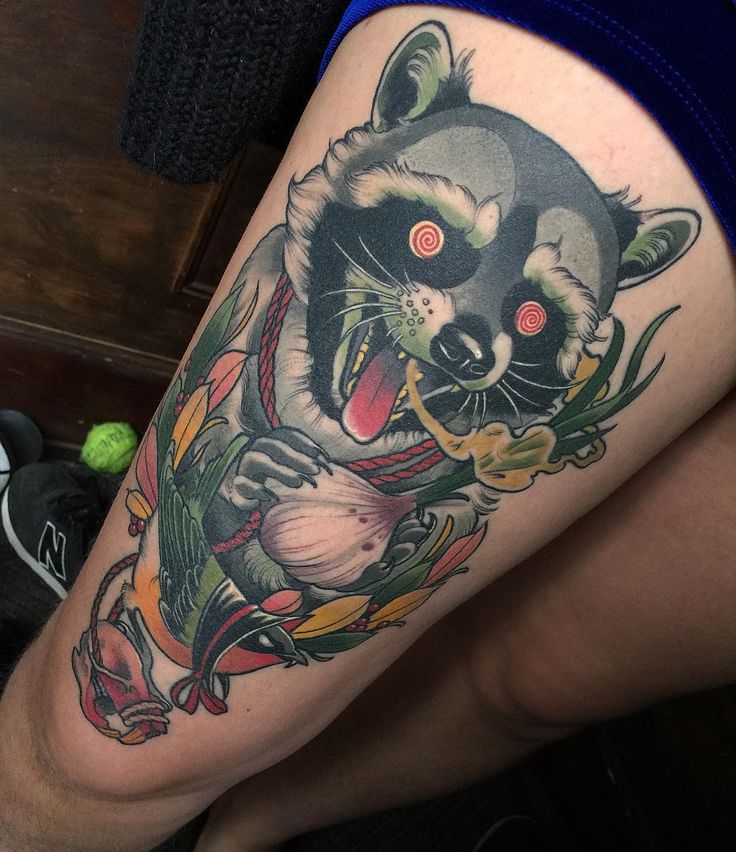 Еноты идеально вписываются в эту растущую эстетику татуировок, благодаря своей мультяшной «маске» и известности озорством.