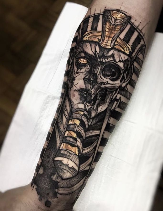 Фараон и череп, кажется, идут рука об руку, когда их татуируют. Говорят, что половина черепа; Половина изображения фараона является египетским символом смерти. Есть также много фильмов, в которых изображен фараон с мумиями и прочей нежитью, так что этот образ кажется подходящим.