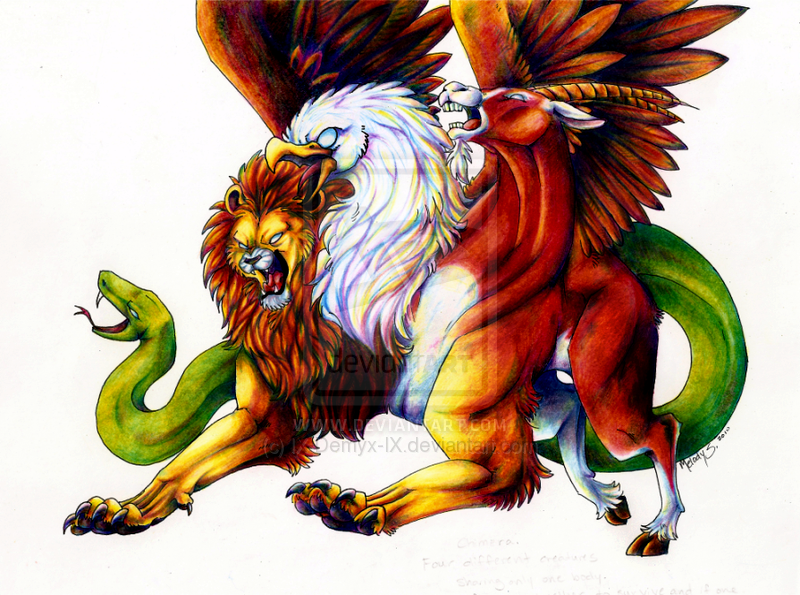 - Химера имеет тело льва, голову козла и хвост змеи. Некоторые люди утверждают, что у него также может быть голова льва и тело козла.