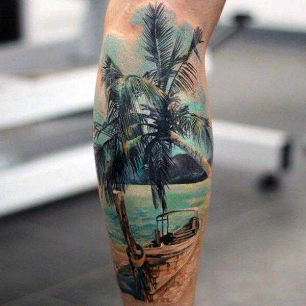 Тату «Пальма» на ноге необязательно должно состоять из одного только дерева. Можно придумать интересные и оригинальные сюжеты, которые подчеркнут нетривиальность выбранного рисунка.