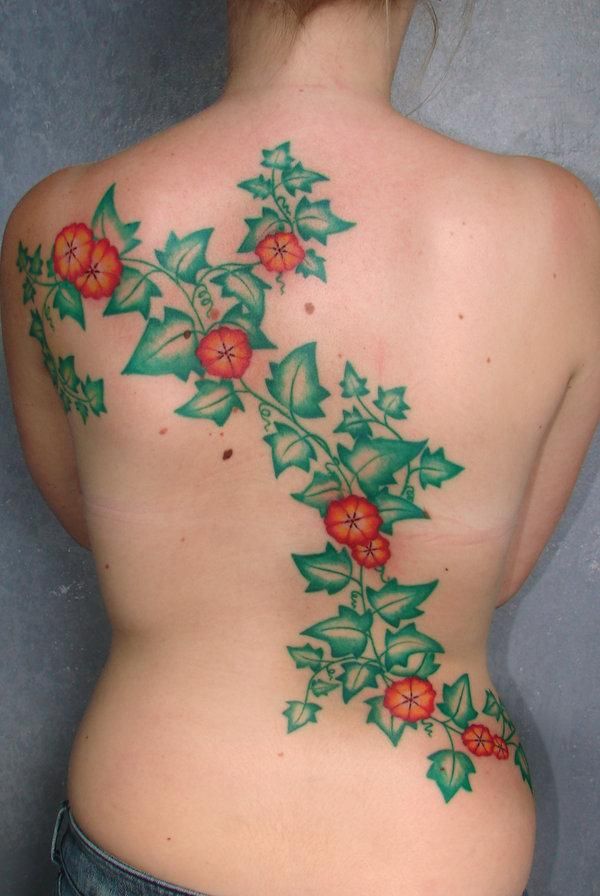 Если вы ищете более крупную татуировку, вы можете сделать плющ, покрывающий большую область, например, спину, а затем украсить цветами.