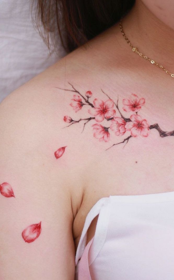 Цветущая сакура — символ женской молодости и красоты, её цветок бледно-розового оттенка воплощает всю неиссякаемую нежность и гармонию женщины в значении тату. Ветка сакуры, что расцветает, может означать начало жизненного пути. Иногда сакуру воспринимают как символ стойкости, потому что цветы на этом дереве появляются на много раньше, чем листочки. Она воплощает в себе всю суть Японской философии. Отцветающая сакура — символ потерянной надежды или любви.