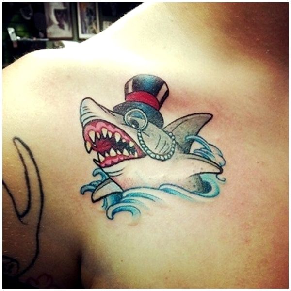 Среди молодых людей всегда найдутся и любители мультипликационного стиля, в этом случае образ хищной акулы можно сделать поистине забавным и даже смешным. Акула является довольно популярным героем мультфильмов, поэтому подобрать такой эскиз для тату не составит большой трудности.