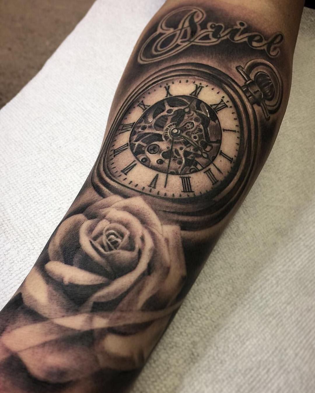 Это свежее тату-изображение часов, лежащих на букете роз.Часы показывают 10:12. Эта татуировка в виде часов будет очень хорошо смотреться на внутренней части бицепса.