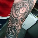 На этой татуировке изображено изображение розы прямо у устья старого черепа. Стрелка часов прижата ко лбу черепа, при этом видна только верхняя часть цифр на часах.