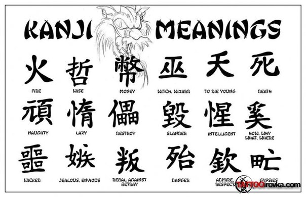 Вот яркие примеры таких иероглифов со значениями, которые люди зачастую набивают себе:
