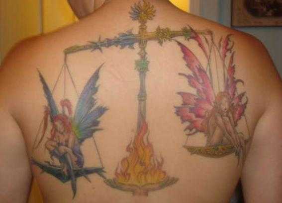 Знак зодиака Весы – тату, выдающее благородных и вежливых эстетов. Они любят порядок, умны, но неуравновешенны. Мешает и нерешительность. Наколка-талисман поможет избавится от ненужных сомнений, устранит нерешительность.