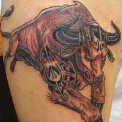 – знак зодиака, телец (бык). Цвета: черный, серый, бордо, неяркий красный, без многоцветия, чтобы тату служила оберегом. Знак зодиака улучшает материальное состояние, добавляет везение и интуицию.