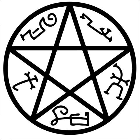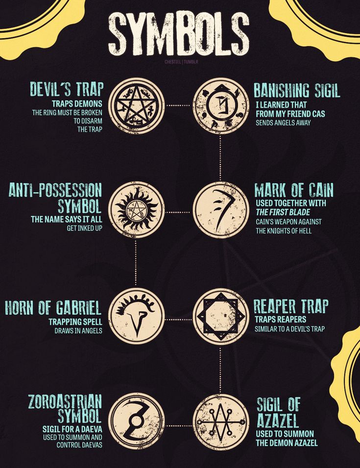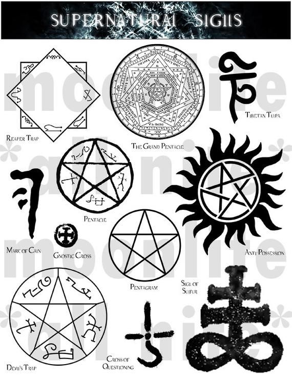 Телешоу Сверхъестественное в значительной степени сосредоточено на борьбе с демонами и, все чаще и чаще, с ангелами. Таким образом, они используют широкий спектр символов, которые, по крайней мере, выглядят так, как будто они являются законными магическими символами. Некоторые из них есть, многие — нет, а другие — под влиянием истории, но на самом деле не исторические.