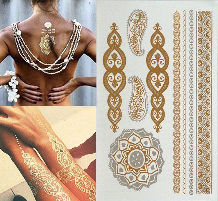Флеш-тату — стильный вариант переводной татуировки. Такие тату отлично дополнят любой образ и будут выглядеть аккуратно. Золотистые и серебристые украшения-тату можно носить с настоящими цепочками, браслетами и кулонами. Главное — подобрать под них тату-наклейки так, чтобы они дополняли украшения.
