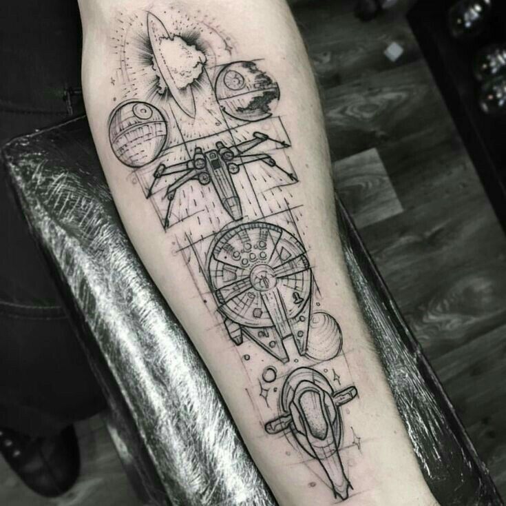 Художник-татуировщик использовал тело владельца татуировки как декорации для собственного фильма и создал абсолютное произведение искусства. Если вы решите сделать это своими руками, ваша рука станет частью живой легенды, дополненной копией сцены галактической битвы. С одной стороны, вы сможете продемонстрировать свои знания о «Звездных войнах», а с другой — носить эту татуировку как почетный знак.
