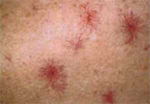 Данные болезни вызывают уплотнение кожного покрова в пораженных местах. Это приводит к застою крови в сосудах, повышению в них давления. При этом капилляры разрушаются, вызывая появление звезды в области повышенного давления крови.