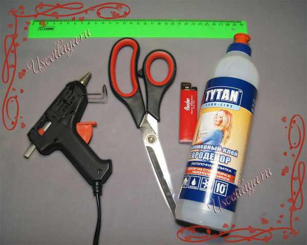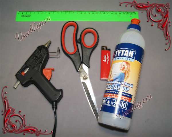 ножницы, клеевой термопистолет, зажигалка, линейка или сантиметровая лента, клей гель прозрачный (можно использовать еще полимерный клей, для приклеивания серединки).
