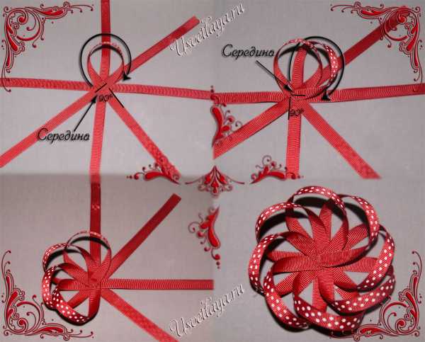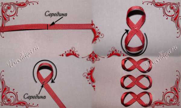 Начнем с самого верхнего бантика-серединки, возьмем ленты шириной 6 мм и длиной 15 см , складываем их пополам, ищем середину, закладываем кончики лент к середине, под прямым углом, делаем «восьмерку», так как показано на фото снизу. У нас должны получиться 3 «восьмерки».