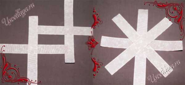 Теперь сделаем бантик-подложку. Берем ленты шириной 22/25 мм и длиной 19 см, складываем их пополам, ищем середину, соединяем их между собой по две крест на крест, дальше получившиеся детали (крестики) накладываем друг на друга крест на крест, так как показано на фото.