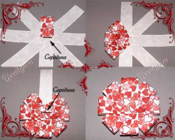 Теперь берем ленты с рисунком по 25 см , первую так же складываем пополам, находим середину, загибаем концы ленты к середине, закрепляем клеем. Теперь возьмем вторую ленту, сложим так же пополам найдем середину, дальше наложим ленту на предыдущую деталь сверху крест на крест, закрепим клеем, так как показано на фото, и теперь загибаем концы этой ленты к середине, только концы этой ленты уже будут ложиться на первую деталь, на фото вы это можете увидеть.