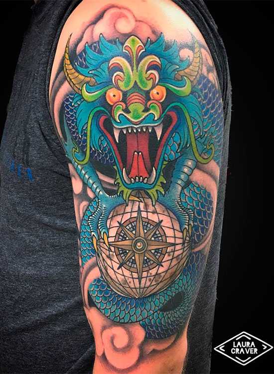 @Alex MorettiВ Японской мифологии дракон занимает важное место, где он считается водным божеством. По традиции его изображают с головой верблюда, лапами тигра, когтями орла и чешуей карпа. Тату японского дракона означает баланс в жизни.
