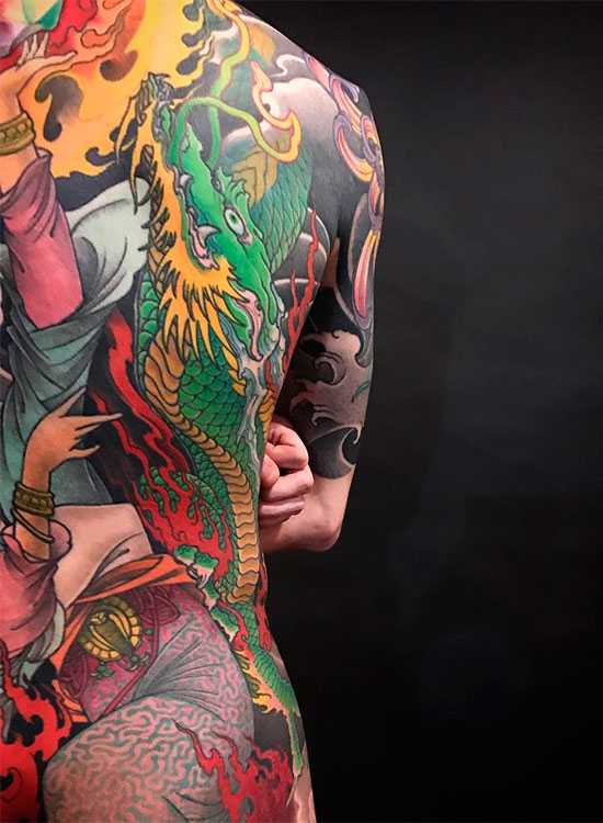 На значение тату оказывают влияние место на теле, цвет дракона, сюжет работы.