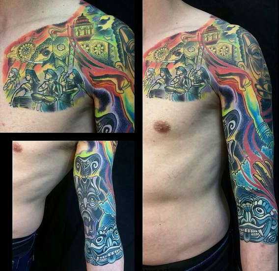 Цветная татуировка на плече и груди
