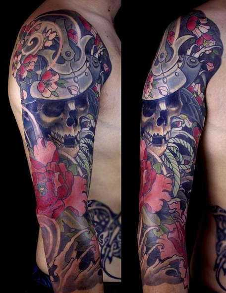 Череп и красный цветок – татуировка рукав