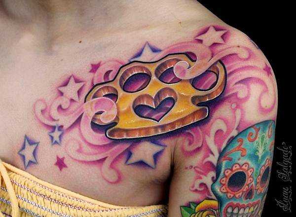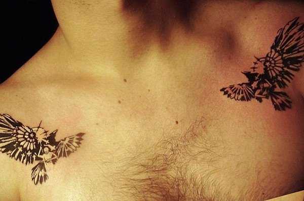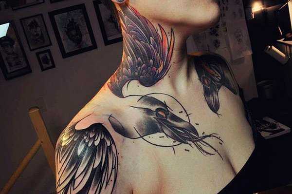 Кроме того, мужские тату по размерам больше, преимущественно имеют горизонтальную направленность и простираются по всему плечевому поясу. Женские – чаще располагают по вертикали или по диагонали. Существует много примеров дамских тату на обеих ключицах, но такой вариант выбирается реже, чем изображение только на одной стороне.