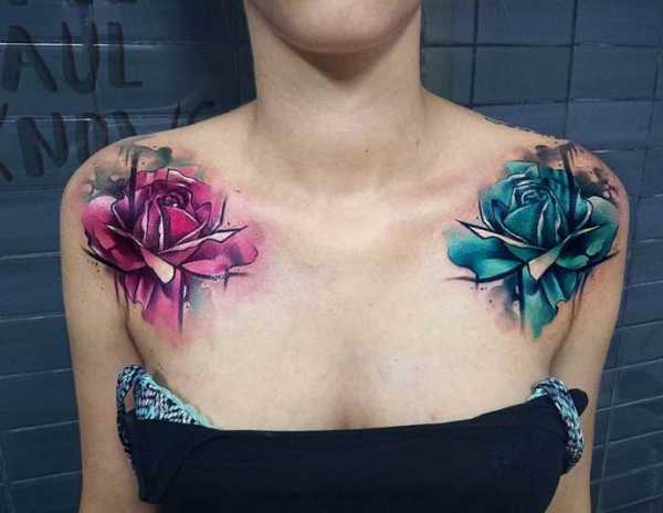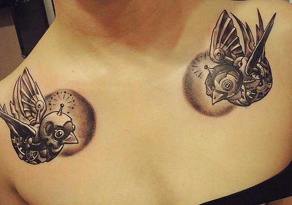 Мастера чаще других исполняют заказы на симметричные татуировки, располагающиеся по обеим сторонам. На обе ключицы наносятся идентичные друг другу рисунки. К примеру, это могут быть две розы. При корректном нанесении таких двойных рисунков, которые необязательно могут быть представлены цветами, получается геометрически правильная и удивительно гармоничная композиция. Вместо розочек можно набить ласточек, бриллианты или звездочки – именно эти варианты на сегодня являются наиболее востребованными.