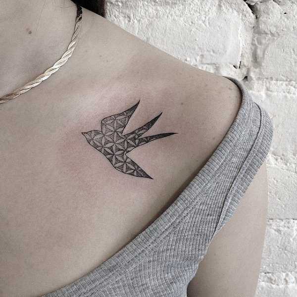 фантастическая птица на ключице линииЕсли же фигура далека от идеала, то посредством татуировок на ключицах ее можно немного скорректировать. Можно заметить, что грамотная работа художника со светом и тенью способна создать иллюзию выделяющихся ключиц, а значит, визуально добавить телосложению худобы. Надо признать, что такие женщины правы, потому что красиво выполненные тату на верхней части туловища придают девушке сексуальность и индивидуальность.