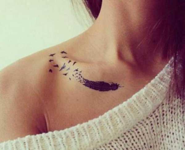 Еще одно распространенное тату на ключицах для девушек – перо птицы: павлина, совы, орла, ласточки. Обладательница подобного рисунка свободолюбива, независима, своенравна. В то же время она романтичная и мечтательная натура, которая стремится навстречу новым впечатлениям, умеет радоваться жизни и верит в светлое будущее. Часто в композиции присутствуют женские надписи, уточняющие интерпретацию татуировки.