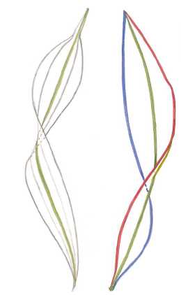 2. Методом сквозной конструктивной прорисовки наметить рисунок легкими, контурными линиями, конструктивных узлов. Наметить общую форму, сравнивая ширину (например, листа) с его длиной, наметить основные пропорции, движения стеблей и листьев, направления жилок.