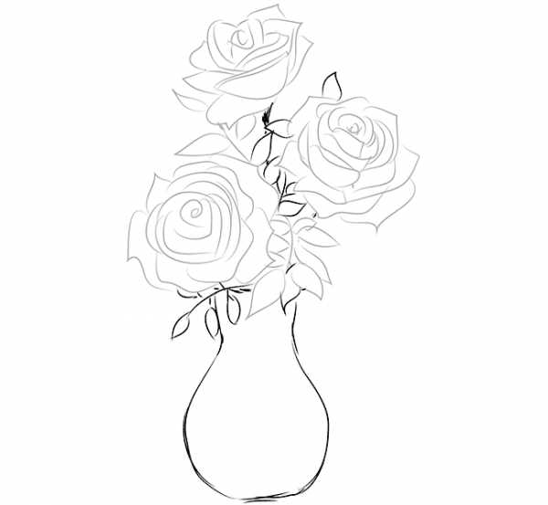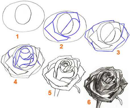 Рисование пышной розы своими рукамиПолученный рисунок выглядит плоским, поэтому на следующем этапе его наполняют объемом и светом.