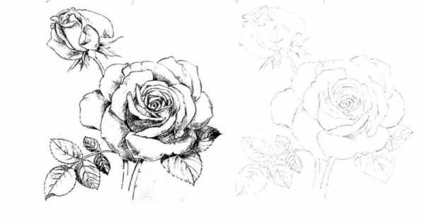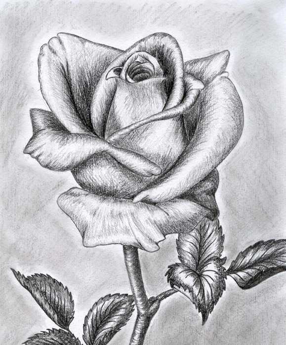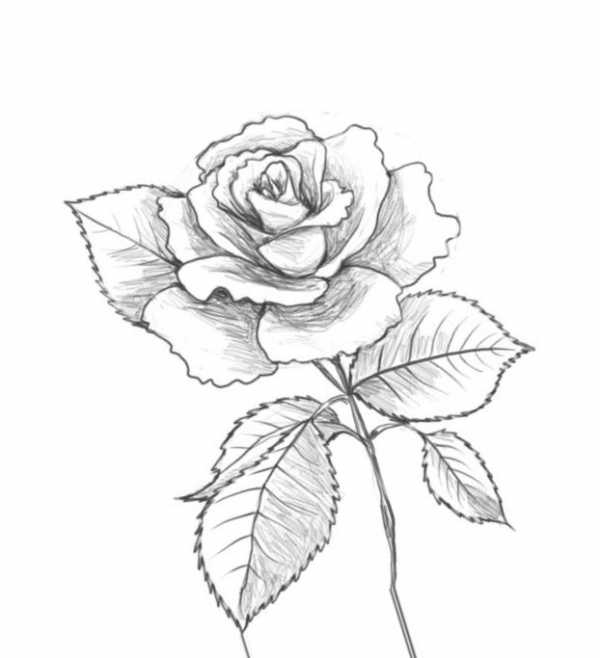 Когда основные этапы рисования освоены, можно переходить к более сложным – штриховке и растушевки. Они позволяют вдохнуть в изображение жизнь, и сделать его наиболее реалистичным. Для этого рисуют, как и в предыдущем примере, сначала общие очертания розы. И вокруг основного бутона, со всех сторон, дорисовывают лепестки, произвольной конфигурации. Добавляют толщину стеблю, и вырисовывают листья и чашелистик. Все основные линии надо навести более четко, и обозначить прожилки листьев. Ненужные контуры удаляют, используя ластик.