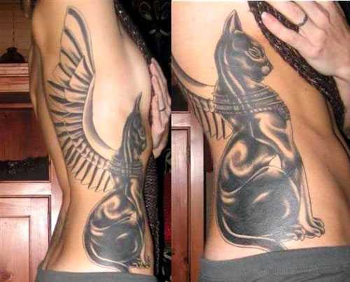 - Священные животные. Самым популярным является кошка. Она символизирует природную красоту и грацию. Предпочтение данной татуировке отдают женщины, изображая их на различных частях тела. Это может быть сама кошка или женщина с головой священного животного.