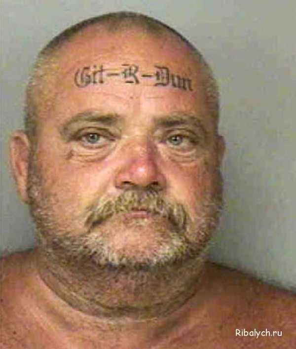 Этот главарь семейной группировки по имени Флойд влепил себе на лоб тату git-r-dun (в переводе со сленга означает “Сделай это”), а на затылке у этого товарища красуется надпись Got-R-Did (что значит “Сделано” )