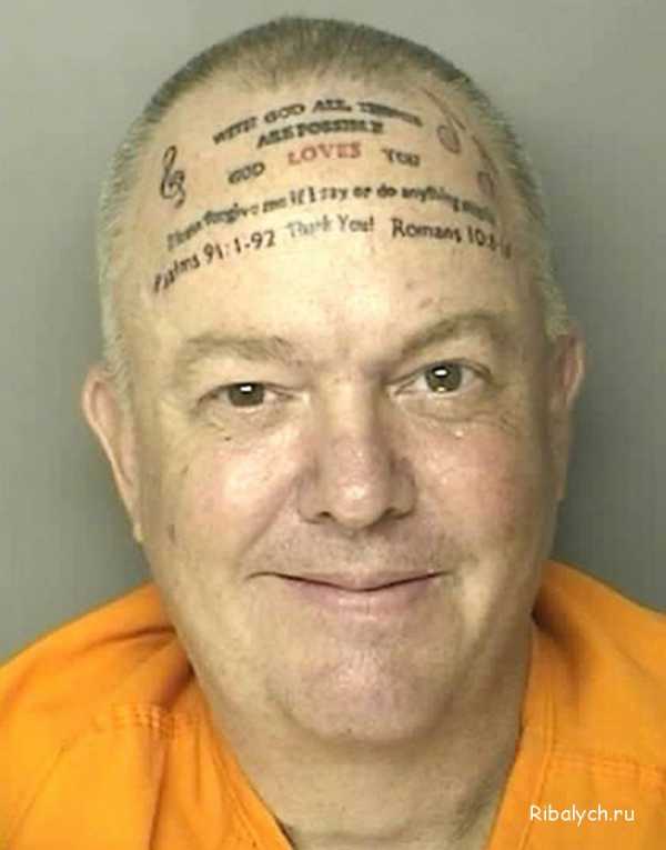 Этот 50-летний Ленс Маккензи Бородач сидел в тюрьме только два месяца. Тату он очень хотел, но не получилось у него её сделать. Поэтому он написал себе на лбу “оближи меня”. Как же его облизывать-то: слишком уж волосатый…