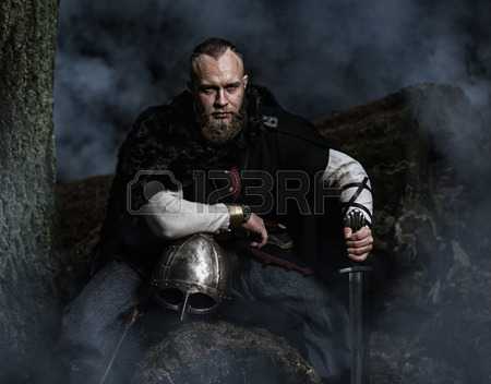 #50627280 – Viking with sword and helmet on a background of smoky forest…