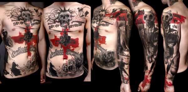 Трешь полька – стиль в котором ярко выражены произведения постмодернизма, уникальность в данного стиля в том, что не одной такой тату как у вас не будет не у кого, этот стиль выполнен в черном цвете, с выделением красным цветом некоторых частей.