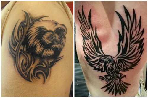 - Медведь – олицетворение силы, мощи, власти. Трактуется этот рисунок, как начало нового этапа жизненного пути или перерождения. Он может быть изображен как добрым и мудрым, так яростным и свирепым. В разных странах этот зверь символизирует и разные качества. В основном медведь относится к мужским тату трайбл, но и на теле девушки можно встретить изображение данного животного. Оно наносится в виде самки с медвежонком и символизирует материнскую любовь и преданность.