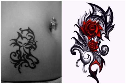 Женские эскизы чаще используют круглые линии. Также можно увидеть, как при помощи подобных узоров на коже изображаются птицы, звери (в т.ч. мифические), цветы, крылья, другие элементы, не свойственные классике и мужскими вариантам.