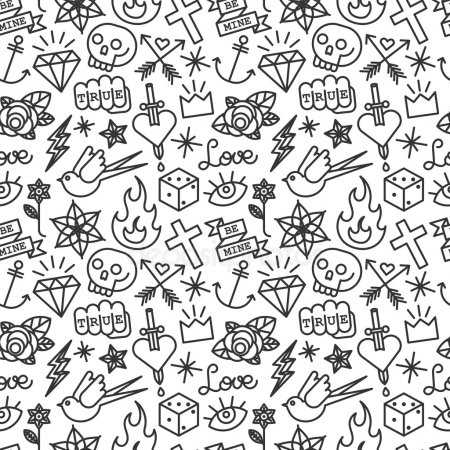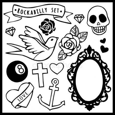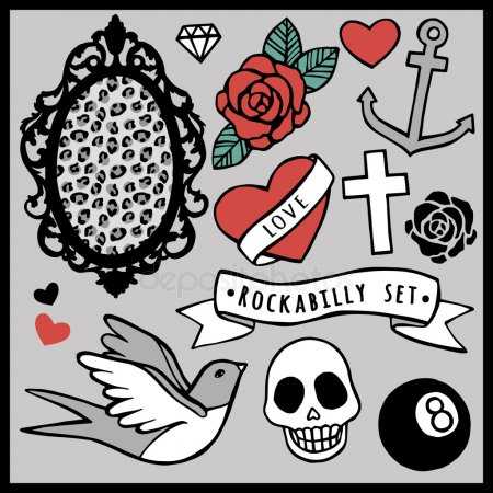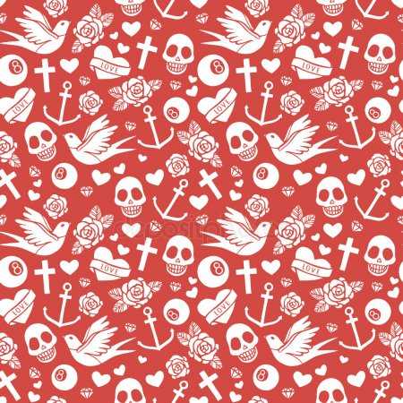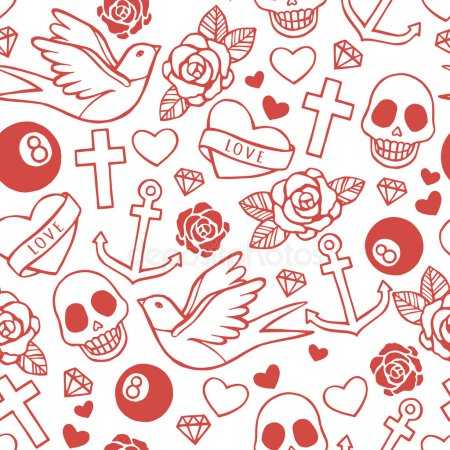 Наиболее распространенными в этом направлении являются такие рисунки как черепа, сердца, ленты, ангелы, кресты, огонь, цветы, якоря.