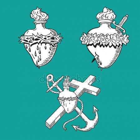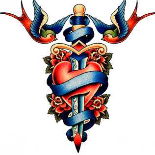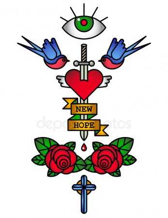 – татуировка в форме сердца, с лентой вокруг сердца или свиток с надписью поперек сердца – здесь объяснения излишни. Ваши пути с некогда любимым человеком могут разойтись, но татуировка останется на прежнем месте. Среди олдскулеров ходит афоризм: “Любовь длится шесть месяцев, но татуировка – навсегда!” Татуировка в форме сердца – классический дизайн направления олдскул, её можно рассматривать как перевернутый треугольник, ставший символом всего женского, и часто используемый как выражение романтичной любви. Сердце – вечный символ любви, чувств и самой силы жизни для всего человечества. По сути, сердце отвечает за чувства и правду. Мы говорим «бессердечный» о человеке, который несправедлив или крайне жесток. Дружба, храбрость, романтичные отношения и эмоциональное выражение также воплощены в этом символе.Человеческое сердце занимает центральное место во всех религиях мира, и признаётся символом любви, а так же божественного начала в человеке. В течение долгого времени оно стало также символом милосердия, благочестия и понимания. Обозначение сердца подходит для выражения любви и радости, а так же для горя и несчастья (разбитое сердце).Также сердце – средневековый символ Христа, жертвы, особенно в римско-католической Церкви. Священное сердце показывает любовь искупления к Богу как источник освещения и счастья, следовательно, огонь и шипы представляют корону с шипами, которую надели Христу (терновый венок), а огонь представляет любовь и духовный пыл – таким образом, изображение сердца стало символом спасения и вечной жизни.Сердце также символизировало центр человека. Мало того, что это был самый значимый физический орган, оно ещё считалось местом духовности и эмоциональным центром, откуда проистекала любовь к божественному. В Евангелиях Иисус говорит о сердце, представляющем любовь, смирение и мягкость. Поскольку этот дизайн татуировки весьма распространён во всем мире, сердца стали очень популярным мотивом в татуировке, особенно у женщин. В олдскуле очень часто такой мотив располагают на груди.Сердце, пронзенное стрелой – символ для выражения направленной энергии, потока и проникновения.Звезды и сердца – символ счастья и благоприятных возможностей.Национальный флаги в виде сердца – распространенный в Америке олдскульный мотив – свидетельствует о большой любви к стране и патриотизме.Руки, держащие сердце – представляет в олдскуле материнский или отеческий вид любви.