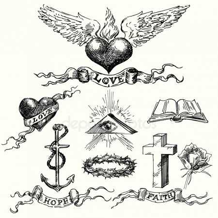 (изображение Иисуса Христа, аллегория) – классика татуировки. Служила символом надежды, защиты и опоры, была своеобразным амулетом и талисманом, например, для моряков. Наличие вытатуированных слов, таких как, например “Держись!” вселяло надежду и веру в моряков и тоже служило амулетом. Другие символы показывали, что моряк пересек Экватор, обогнул Мыс Горн или посетили Дальний Восток, к примеру.Другая версия татуировки крест и/или изображение Иисуса Христа заключалась в том, что религиозный символ, вытатуированный на спине моряка, мог смягчить наложенное дисциплинарное (часто телесное) взыскание, и такой моряк, вероятно, был бы менее строго наказан. Другая популярная татуировка, известная уже много десятков лет, изображает моряка или человека, стоящего на коленях перед крестом, высеченным из твердого камня. Христианская вера человека часто упоминалась как камень, основа-фундамент, на которой построена добродетельная жизнь. Это основывалось на вере, что дом или здание были только столь же крепки как фундамент, на котором возводились. Каменный крест был известен в течение долгого времени под названием “Скала Веков” или крест моряка.