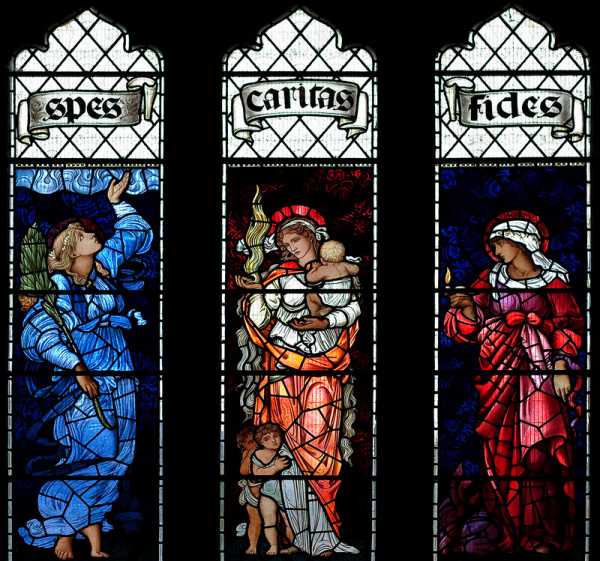 ST. MARTIN’S CHURCH. BRAMPTON, CUMBRIA. Hope, Charity, Faith’ (Spes, Caritas, Fide), stained glass window designed by Burne-Jones and executed by Morris and Co.(William Morris) in 1886