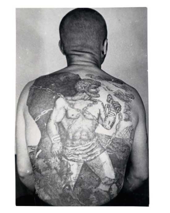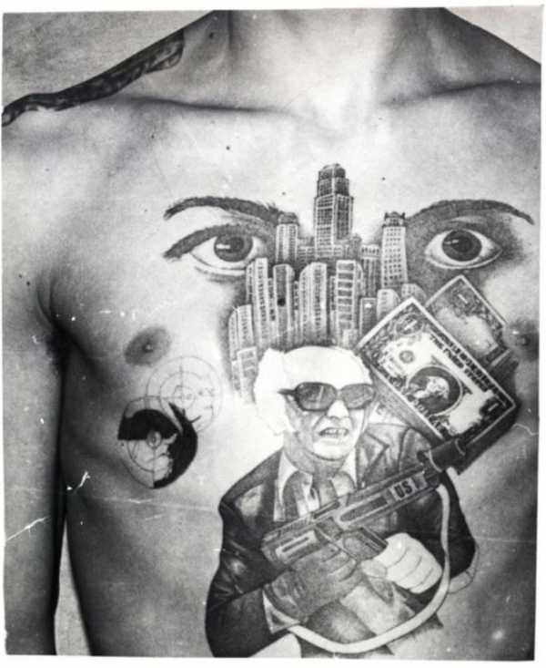 Двуглавый орел – символ русской государственности, уходящий корнями в XV век и использовавшийся Петром Великим. После падения коммунизма в 1993 году он заменил серп и молот на гербе Российской Федерации. Фотография сделана в советский период, тогда татуировка в виде этой эмблемы была знаком ненависти к СССР. Его также можно трактовать как «Россия для русских» или «За Россию без жидов, хачей и марксистов-ленинистов». Статуя Свободы указывает тоску по свободе, а темный персонаж с ружьем говорит о том, что этот заключенный готов к насилию и убийствам. Глаза на груди означают «Я вижу все» и «Я слежу», это знаменитая татуировка заключенного, принадлежащего к касте «смотрящего». Восьмиконечная звезда на плечах означает, что ее обладатель – вор-авторитет.