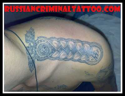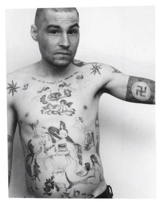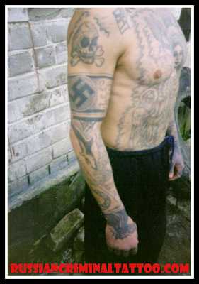 Текст на груди гласит: «Кто не со мною, тот против меня». Свастика и нацистские символы могут означать что, владелец имеет симпатии к фашистским тенденциям, хотя чаще всего свастики делаются как протест и проявление агрессии по отношению к тюремной или лагерной администрации. В советский период власти часто удаляли эти татуировки с помощью силы: либо хирургическим путем, либо с помощью вытравливания. Татуировка русалки может указывать на срок за изнасилование несовершеннолетнего, или растление малолетних. На тюремном жаргоне прозвище для человека, который совершает такого рода преступления звучит как «Амурик»(смысл «амура»), «мохнатый» или «Земля — круглая»(неминуемость возмездия). Таких людей воровское сообщество сильно «опускает» в статусе.