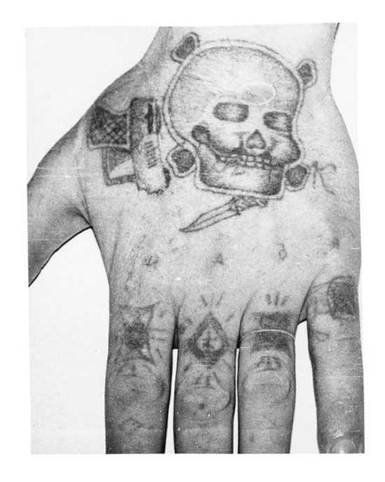Надпись на костяшках пальцев – татуировка женского имени Надя. «Перстень» на указательном пальце означает: «Не верь никому, кроме себя», «Пацан» — одна из самых привилегированных криминальных тату среди заключенных ИТК. На среднем пальце татуировка карманников – «крест воров». Безымянный палец: «Отсидел в полной мере», «От начала до конца», «Сидел без права на УДО»: заключенный отбывал в колонии полный срок, без перехода на вольное поселение по условно-досрочному освобождению. Татуировка мизинце: «Темная жизнь» говорит о том, что носитель провел много времени в карцере. Череп и скрещенные кости, пистолет, нож и буква «K» (Иллер — прим.ред.) обозначают убийцу.