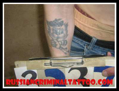 Тюремная татуировка с изображением медведя — признак медвежатника, взломщика сейфов. «Новые уголовные татуировки появляются крайне редко. Единственное исключение, которое я встречал, — изображение шприца. Это традиционный знак наркоманов. Недавно появилась мода наносить рядом с ним буквенное обозначение конкретного наркотика, который употреблял человек», — отмечает Сидоров.