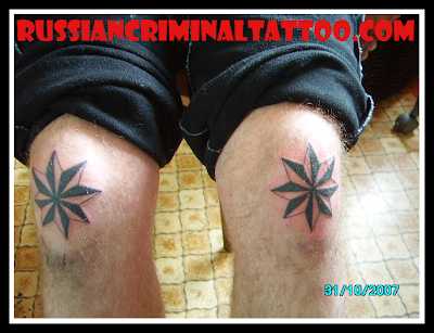 Восьмиконечные звезды – эмблемы вора-авторитета, живущего по «воровским понятиям». Существует много вариантов «воровских» звезд. Линии внутри концов звезды означают, что обладатель татуировки нес военную службу, но бросил ее и ушел в криминал, буквально татуировки таких заключенных означают «Я презираю армию».