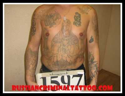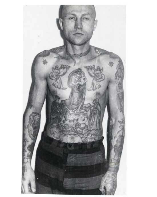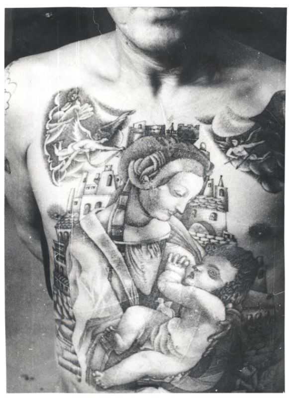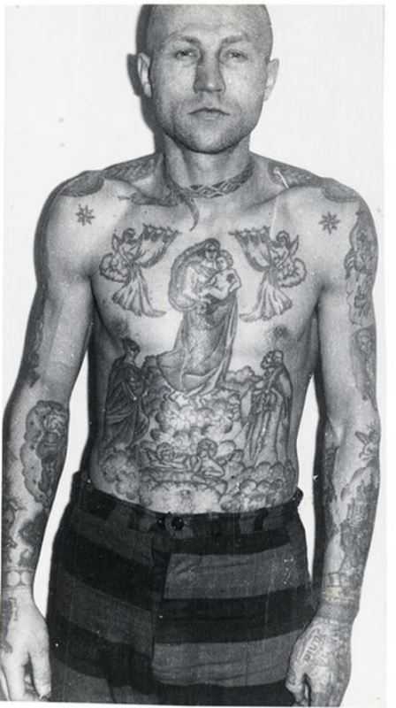Змея вокруг шеи является статусным символом наркомана. Звезды на ключицах и погоны на плечах показывают, что этот заключённый является криминальным авторитетом. Мадонна с младенцем является одним из самых популярных сюжетов татуировок и может иметь несколько значений. Один из символов – верность преступной группировке, другой символ – носящий считает, что Матерь Божья сможет отогнать от него зло или в некоторых областях такая татуировка указывает на то, что владелец был за решеткой с раннего возраста.