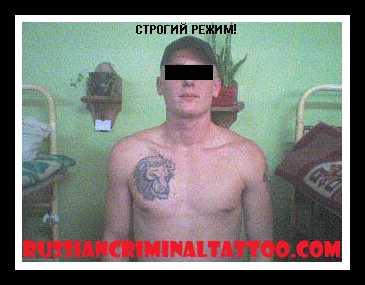 Этот человек является мусульманином, его татуировки также указывают, что он не русский: на его животе (слева) — мечеть с полумесяцем. Он не является авторитетным вором, но пытался подражать с помощью тату, чтобы улучшить свое положение в тюрьме: Маяк на правой руке означает стремление к свободе. Оковы на каждом запястье указывают на срок более пяти лет в тюрьме.