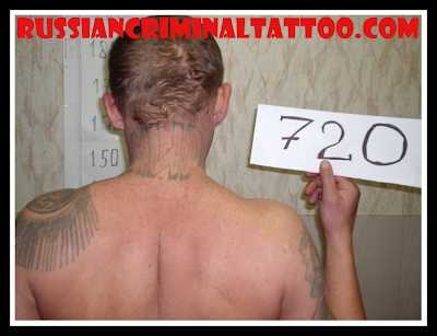 Надпись на руках: «Спасибо дорогая Родина за юность разрушенную нашу». Кинжал через шею показывает, что преступник совершил убийство в тюрьме и он доступен для следующих убийств. Капли крови могут означать число совершенных убийств. Татуировки с портретами Ленина и Сталина на груди ЗК считались в СССР защитой от пули чекистов, поскольку те не станут стрелять в изображение вождей.